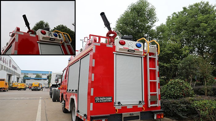 在箱體尾部上方還有兩個紅藍(lán)兩色的爆閃燈,它們的作用是讓出警時(shí)的消防車更加醒目,同時(shí)提醒行人和車輛及時(shí)避讓。箱體尾門卷閘門旁邊還有一架折疊梯子,它的作用是方便消防員到車頂取用或操作消防設(shè)備,設(shè)計(jì)很周到。這個小細(xì)節(jié)也很重要,在尾門下面可以看到兩個黃色的圓環(huán),它們的作用是能夠讓這臺泡沫消防車在必要時(shí)牽引車輛或清理障礙。