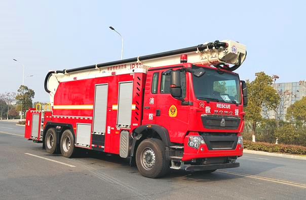 JP32米舉高噴射消防車是選用中國重汽T系列豪沃消防車底盤,原廠單排雙開門駕駛室,可載含駕駛員在內(nèi)的乘員2人,駕乘舒適輕便;集水罐車、泡沫車、高噴車三者功能與一身,具有高層滅火、火場監(jiān)控、快速作戰(zhàn)等國內(nèi)先進水平的高性能多功能消防車。該車采用電液比例及下車集中控制技術,是全液壓驅(qū)動、伸縮加折疊臂式消防車;同時該車自帶7噸水罐及2噸泡沫罐,可在距離水源較遠的位置完成消防作業(yè)。該車綜合應用新技術、新工藝、新材料并結(jié)合自身技術優(yōu)勢,豐富高噴車的功能配置,提高了高噴車的單車作戰(zhàn)能力。