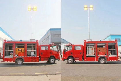 駕駛室頂部前端為長排警燈,車身后配有24V/60W火場照明燈一只,車輛兩側(cè)上方各配有紅藍相配的爆閃燈,下方安裝安全標志燈,乘員室、器材箱、 泵房內(nèi)均裝有照明燈,加裝有100W警報器,回轉(zhuǎn)警燈開關(guān)、通訊設(shè)備預(yù)備接口。